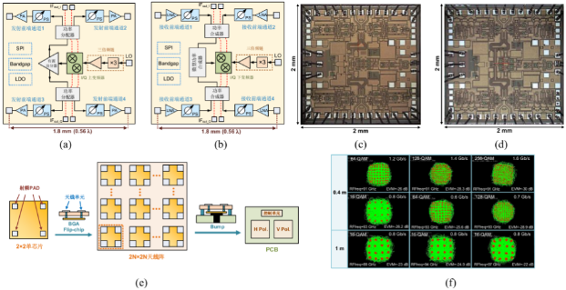 图1. 94 GHz四通道相控收发芯片组。(a) 发射芯片原理图;(b) 接收芯片原理图;(c) 发射芯片照片;(d) 接收芯片照片;(e) 94 GHz相控阵组阵方案;(f) 94 GHz芯片样品传输实验。