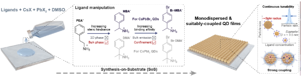 图1. 钙钛矿量子点固体薄膜原位可控合成策略示意图。