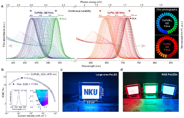 该研究从化学学科出发,利用光学、凝聚态物理、半导体器件等交叉学科手段,成功实现了半导体材料理化性质可控调节。该成果打破了传统量子点合成策略的瓶颈,发展了全新的原位合成量子点固体薄膜新原理与新方法,同时也为钙钛矿量子点材料在其它半导体光电器件中的进一步应用提供了新思路。