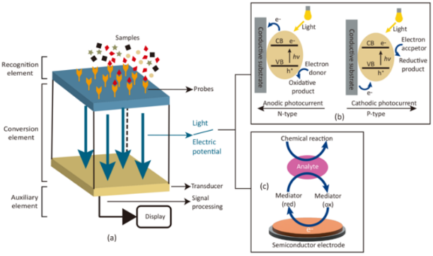 图1. 半导体生物传感器原理示意图。(a)半导体生物传感器工作流程图。传感部分主要分为光学传感和电化学传感。(b)光学生物传感器主要原理的示意图。(c)电化学生物传感器主要原理的示意图。