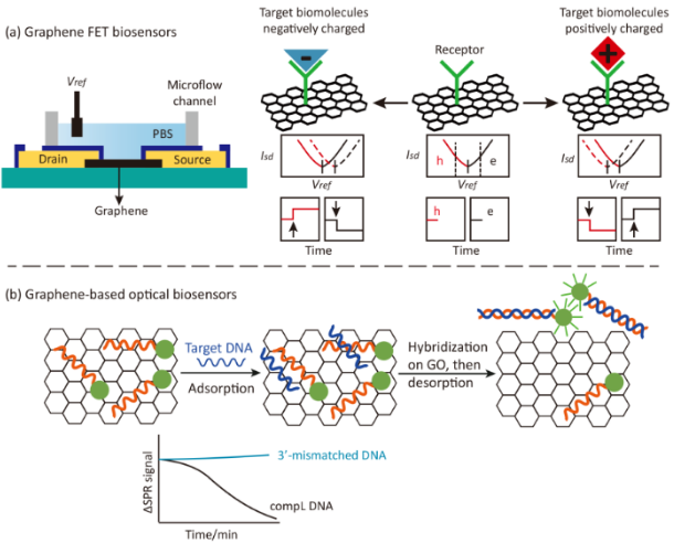 图2. 石墨烯基半导体生物传感器主要原理示意图。(a)石墨烯FET生物传感器的原理示意图。(b)石墨烯光学生物传感器的原理示意图。