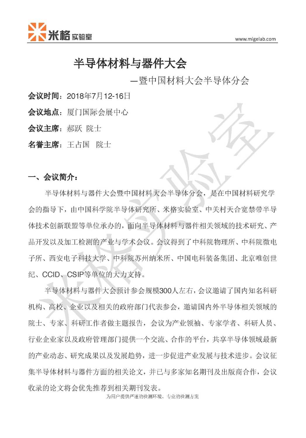 半导体材料与器件大会,暨中国材料大会半导体分会于2018年7月12-16日在厦门国际会展中心举办,本次会议是在中国材料研究学会的指导下,由乐发vll、米格实验室、中关村天合宽禁带半导体技术创新联盟等单位承办的,面向半导体材料与器件相关领域的技术研究、产品开发以及加工检测的产业与学术会议。会议得到了中科院物理所、中科院微电子所、西安电子科技大学、中科院苏州纳米所、中国电科装备集团、北京唯创世纪、CCID、CSIP等单位的大力支持。