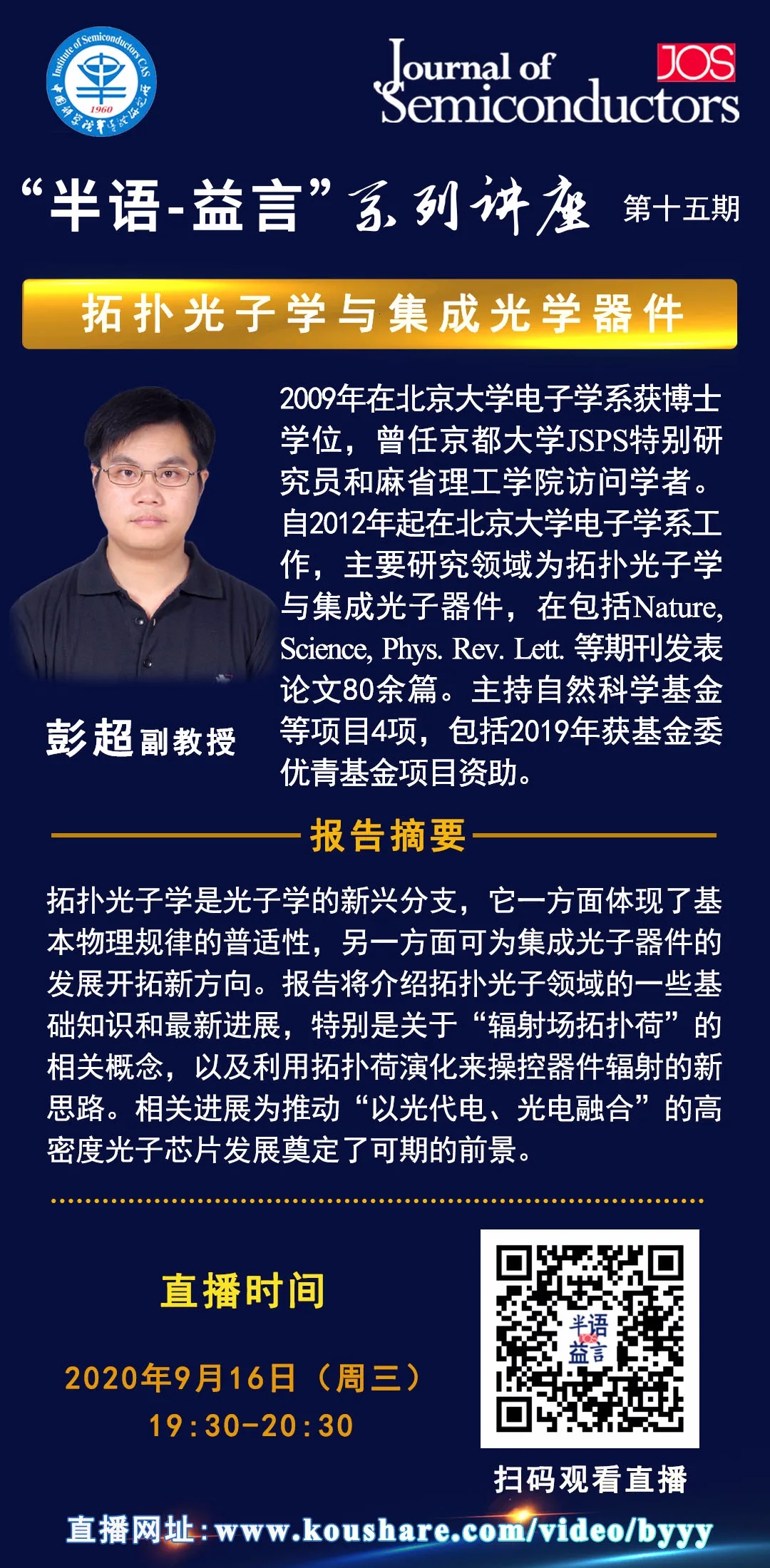 【直播预告】“半语-益言”系列讲座第十五期 | 北京大学彭超副教授:拓扑光子学与集成光学器件