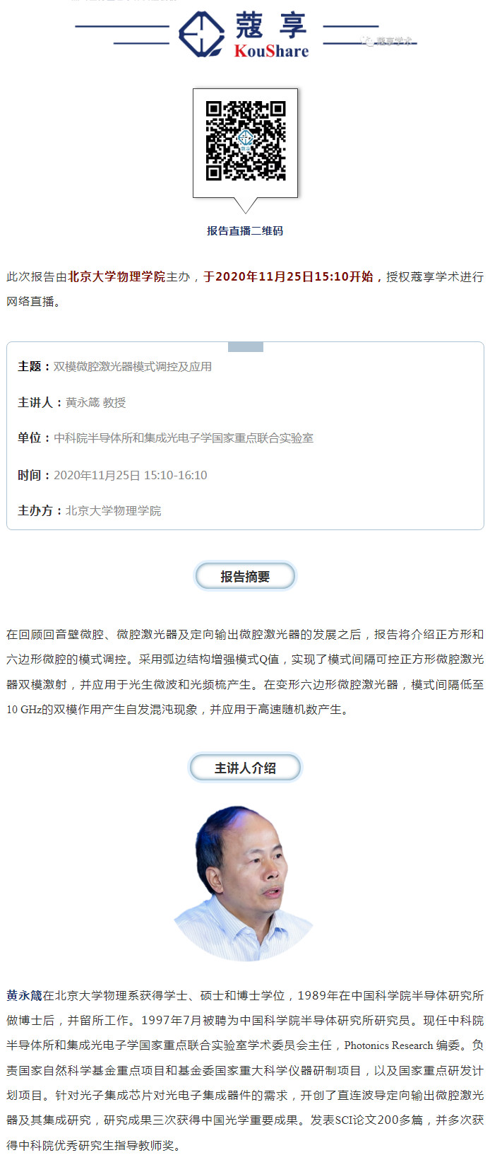 【直播预告】北京大学物理学院 | 黄永箴教授:双模微腔激光器模式调控及应用