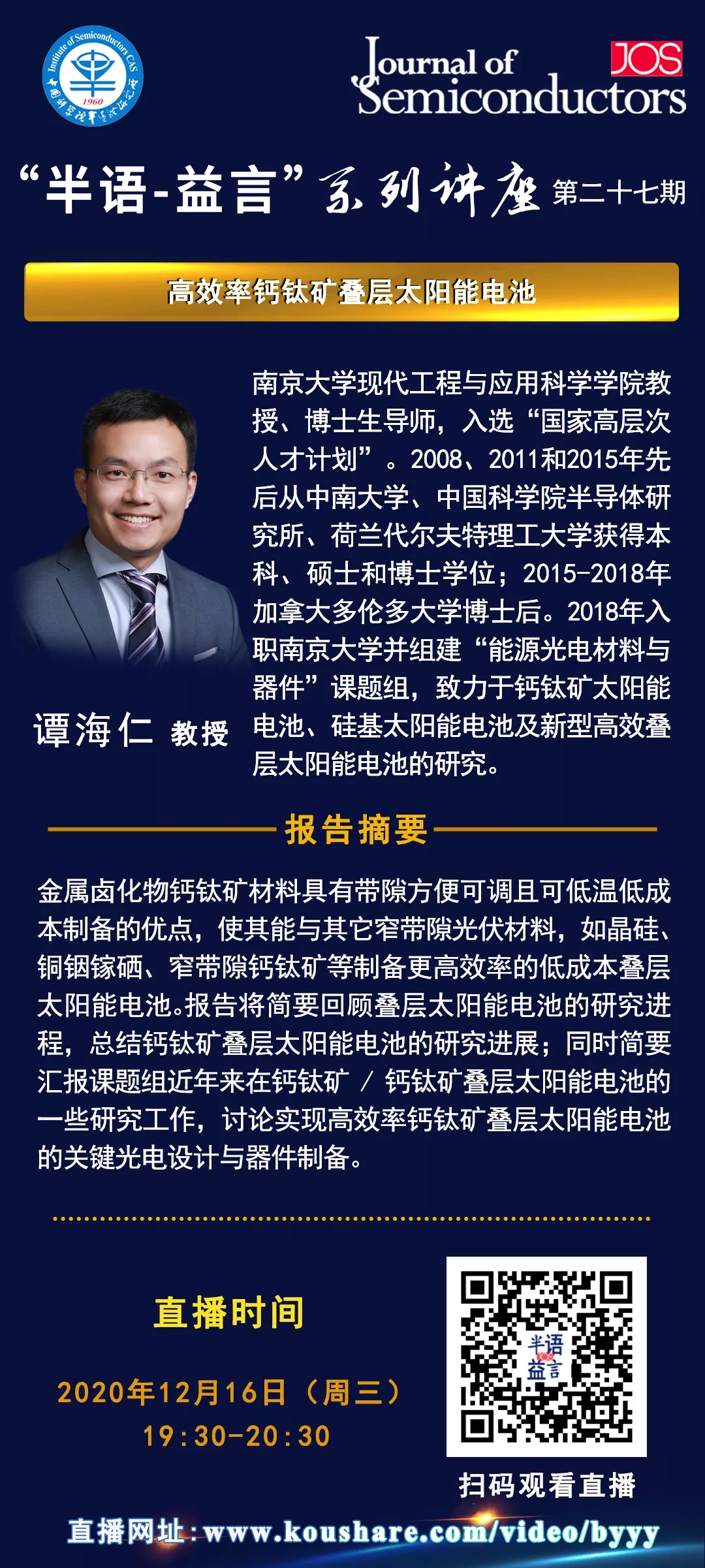 【直播预告】“半语-益言”系列讲座第二十七期 | 谭海仁教授:高效率钙钛矿叠层太阳能电池
