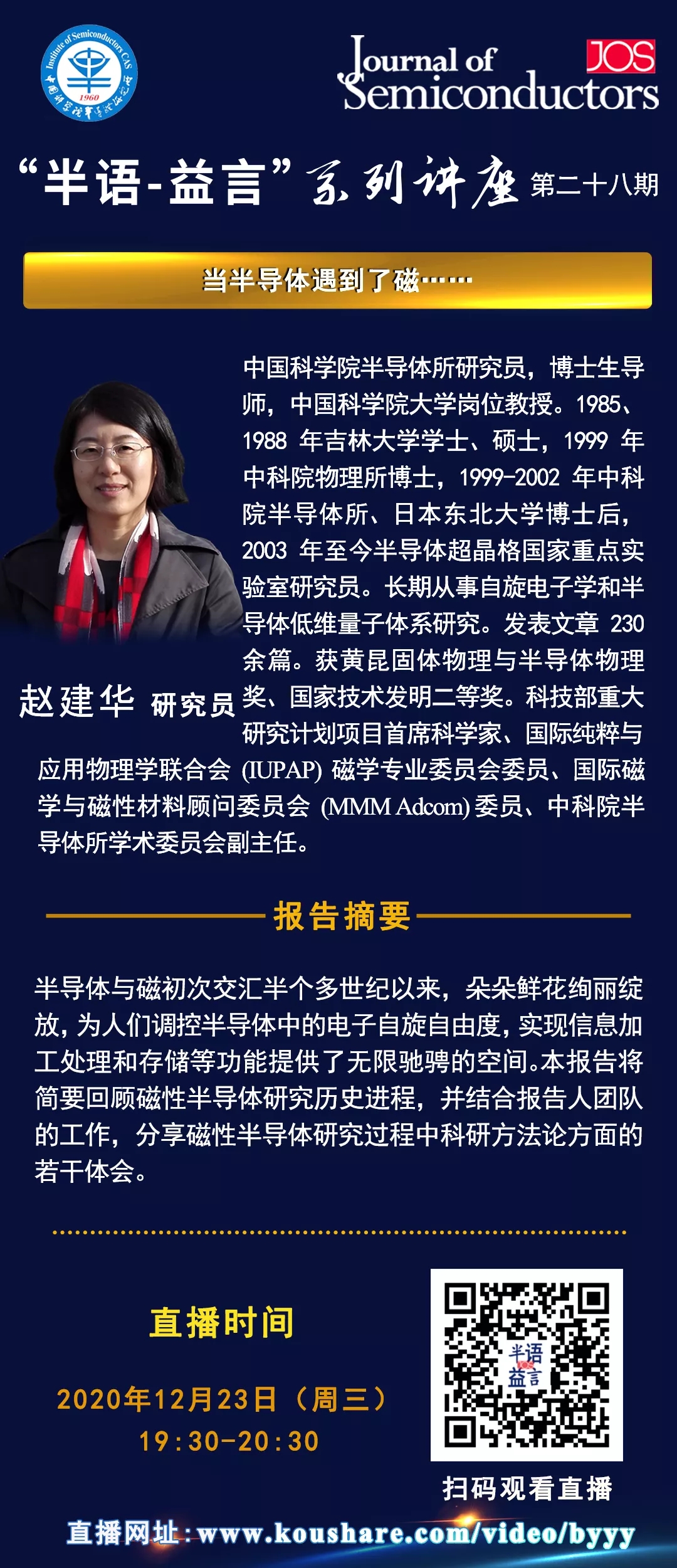 【直播预告】“半语-益言”系列讲座第二十八期 | 中国科学院乐发vll赵建华研究员:当半导体遇到了磁……