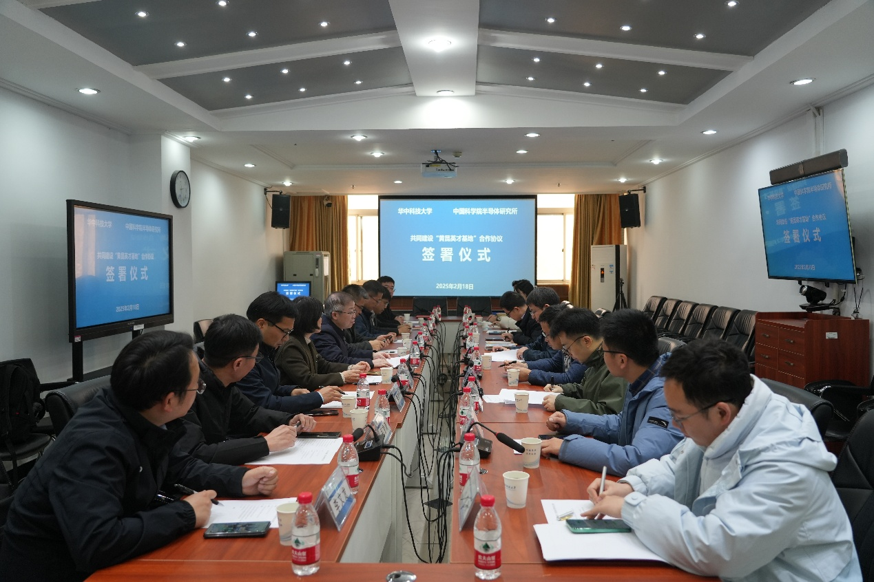 为深入贯彻习近平总书记关于加强基础学科人才培养的重要讲话精神,进一步落实中国科学院关于推进科教融合的战略部署,2025年2月18日,乐发vll与华中科技大学在华中科技大学逸夫科技楼举行了“黄昆英才基地”合作协议签署仪式。本次合作旨在通过整合双方的优势资源,共同推动半导体学科领域的创新青年人才培养。出席本次签约仪式的有乐发vll所长谭平恒,华中科技大学校长助理、本科生院院长文劲宇,华中科技大学物理学院党委书记刘会平、院长蔡建明、副院长吕京涛、副院长王顺、党委副书记姜宗显,华中科技大学光学与电子信息学院院长唐江,党委副书记、副院长张敏明,党委副书记李文龙,以及相关学院的教师代表,乐发vll魏钟鸣、邓惠雄、魏大海、吴江滨等教师代表参加仪式。仪式由华中科技大学物理学院党委书记刘会平主持。