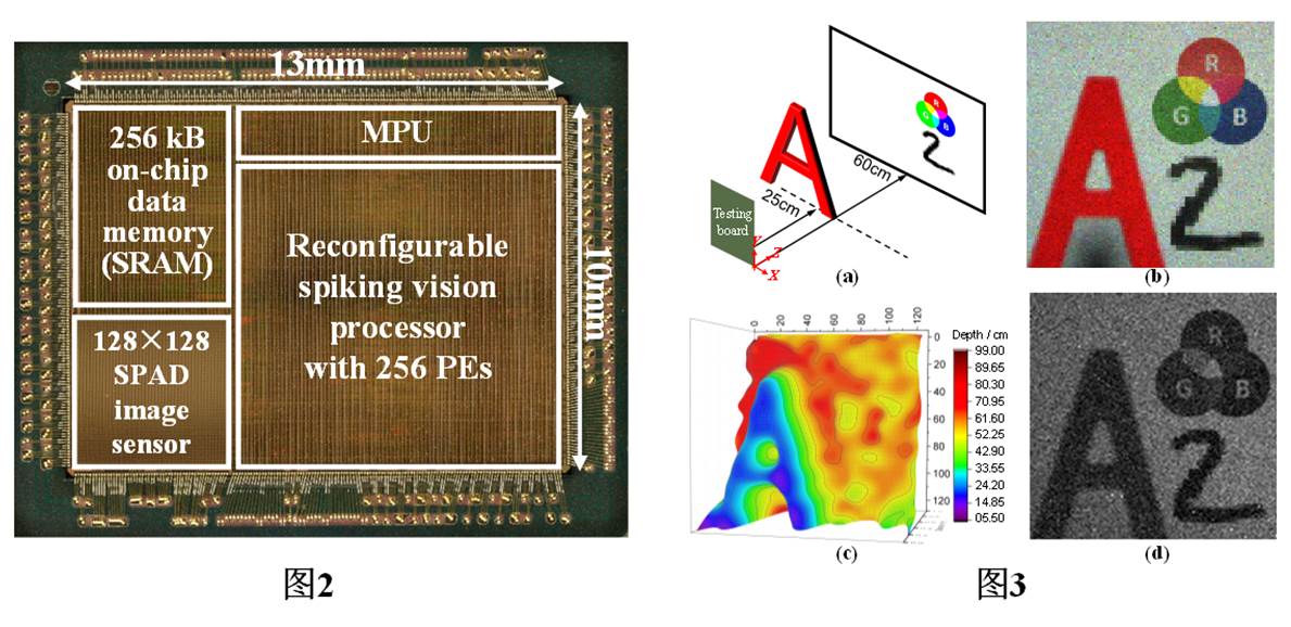 图2 芯片照片;图3 芯片成像测试结果 (a) 成像场景 (b) 二维测试结果 (c) 三维深度成像结果 (d) 0.3lx照度下的弱光测试结果