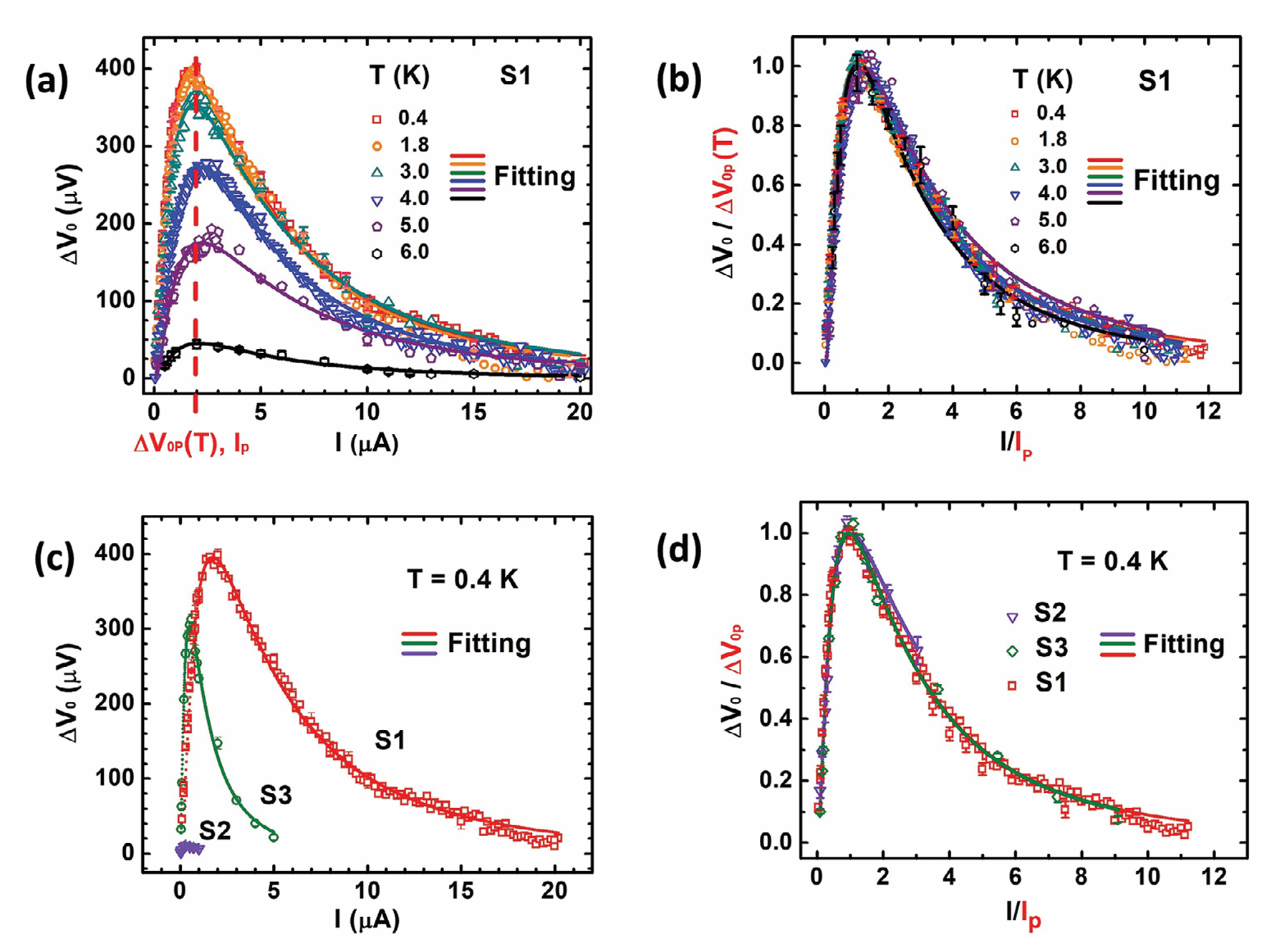 图2 Hanle峰值信号的普适偏置电流依赖关系。器件S1在不同温度下 (a) Hanle峰值信号随偏置电流的变化曲线; (b) 归一化Hanle峰值信号的偏置电流依赖曲线。温度为0.4 K时三个不同器件的 (c) Hanle峰值信号随偏置电流的变化曲线; (d) 归一化Hanle峰值信号的偏置电流依赖曲线