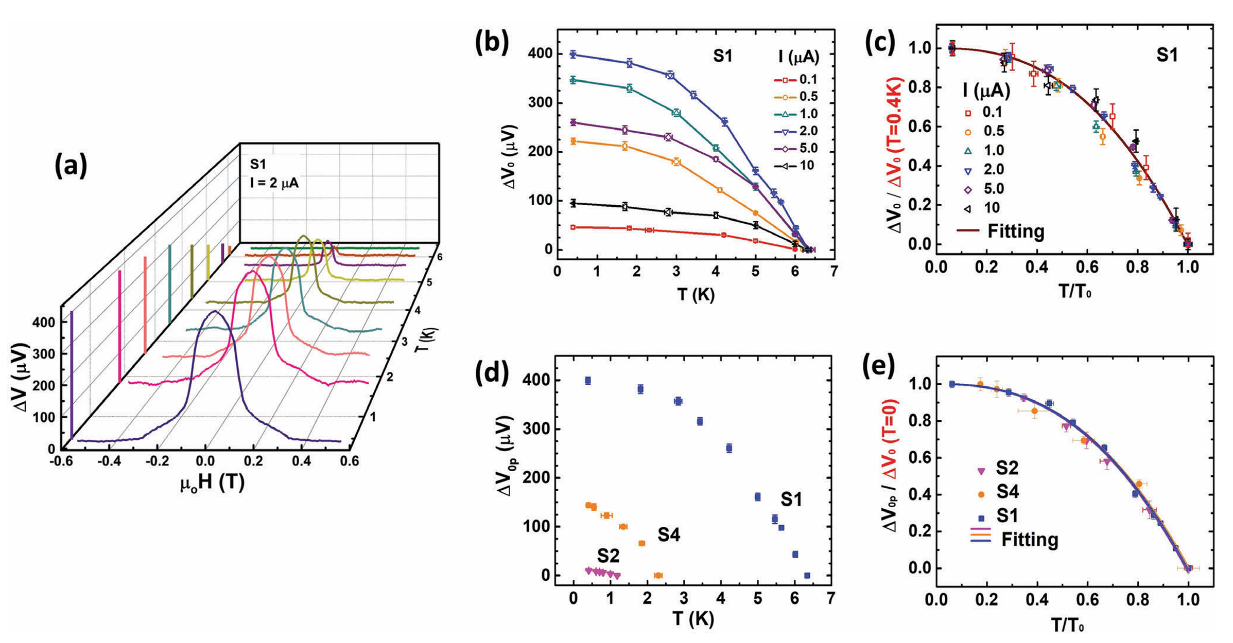 图3 Hanle信号的普适温度依赖关系。(a) 器件S1在不同温度下的Hanle信号。(b) Hanle峰值信号随温度的变化曲线; (c) 归一化Hanle峰值信号的温度依赖曲线。(d) 三个不同器件的Hanle峰值信号随温度的变化曲线; (e) 归一化Hanle峰值信号的温度依赖曲线