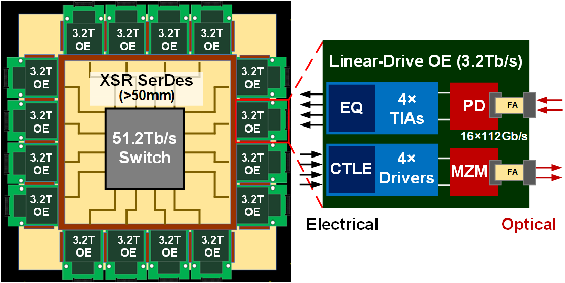 数据密集型人工智能计算的爆炸式增长对数据中心的互连带宽提出更高要求。传统可插拔光模块难以满足新型51.2T以太网交换机对功耗和外形尺寸的要求,必须采用功耗较高的基于DSP的光收发机来补偿每通道的损耗。通过将紧凑型光引擎紧密集成到交换机封装中,板载金属线大部分被光纤取代,从而节省了信号功率并提高了前面板的带宽密度(如图1所示,每个3.2T的光引擎在封装中实现了光纤通道直接连接到交换机封装边缘)。与此同时,集成的共封装光学器件(CPO)用嵌入了连续时间线性均衡器(CTLE)的线性驱动器和放大器取代了 DSP,从而简化了光收发机。近年来,这种线性直驱CPO逐渐受到关注,因为它能显著降低功耗、成本和延迟。