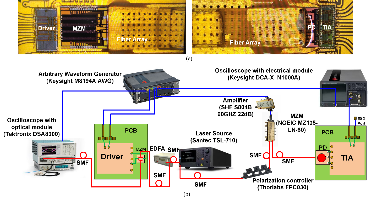 乐发vll半导体物理实验室刘力源、祁楠研究员团队,长期专注于高速硅基光电集成收发机的研究,并取得了一系列成果。团队成功构建了由时钟数据恢复电路(CDR)、分布式CMOS驱动器与集总分段式马赫-增德尔调制器(MZM)构成的单路50Gb/s光电发射机(JSSC,2022),和由硅光探测器(PD)、跨阻放大器(TIA)与CDR构成的单路50Gb/s光电接收机 (TCAS-I,2023)。近期,刘力源、祁楠研究员团队与国家信息光电子创新中心总经理肖希合作,在4×112Gb/s线性直驱硅基光电集成收发机研究领域取得新进展,构建了了用于线性直驱CPO的4×112 Gb/s硅基光电混合集成收发机组件。