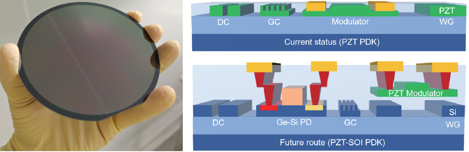 图 1. 4英寸PZT 晶圆(左)和光子集成工艺平台(右)