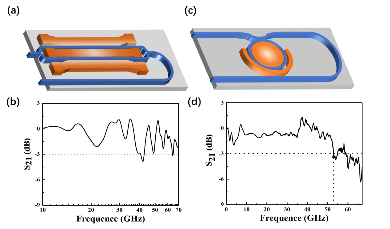 图 3. PZT 电光调制器性能指标。(a)和(b)是马赫-曾德尔电光调制器结构和调制特性;(c)和(d)是微环电光调制器结构和调制特性