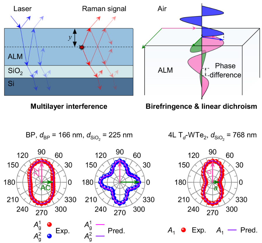 2015年H. B. Ribeiro等人发现,在ALM中,ARPR强度反常地依赖于ALM薄片厚度和激发光波长。该实验现象发现10年来,尽管众多研究组花费了大量的精力,比如考虑ALM中的双折射或者线性二向色性等效应来尝试理解这种反常行为,但是,正确并深入理解ALM的拉曼张量R对于薄片厚度和激发光波长的反常依赖关系仍然存在巨大困难。理论上,双折射和线性二向色性会导致入射、散射光场的偏振方向和幅度依赖于在ALM内部中的深度,ALM内部的拉曼散射过程与ILM完全不同,拉曼散射过程发生处的入射、散射光场的偏振矢量