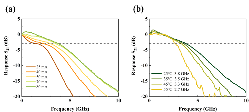 1 器件在(a)室温变电流及(b)变温条件下的小信号频率响应