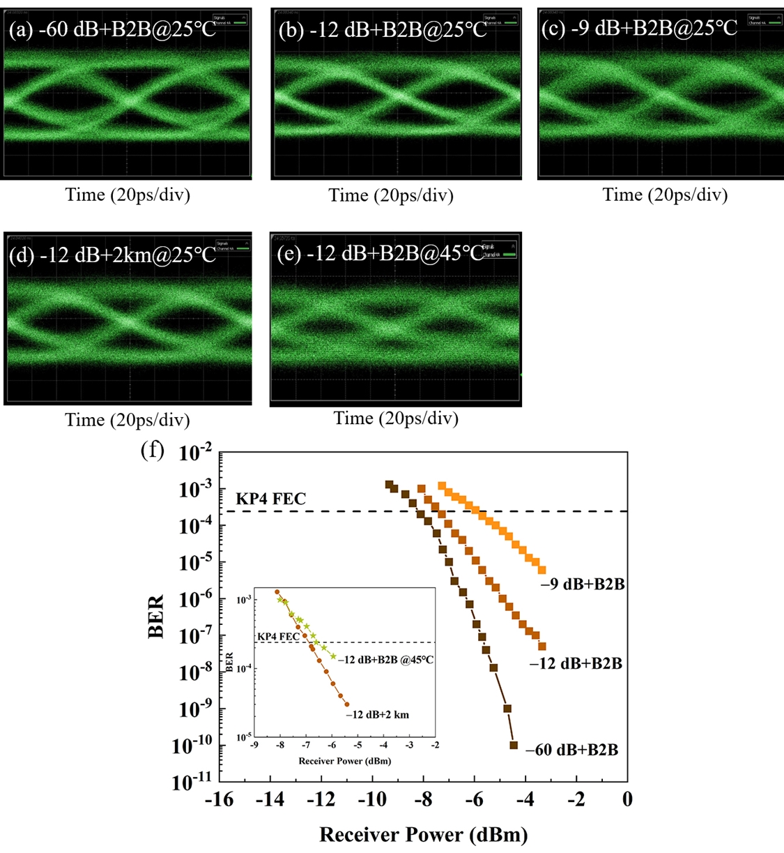 2器件在不同的(a-c)光反馈强度、(d-e)传输距离和工作温度条件下的10 Gbit/s NRZ调制眼图和(f)系统误码率