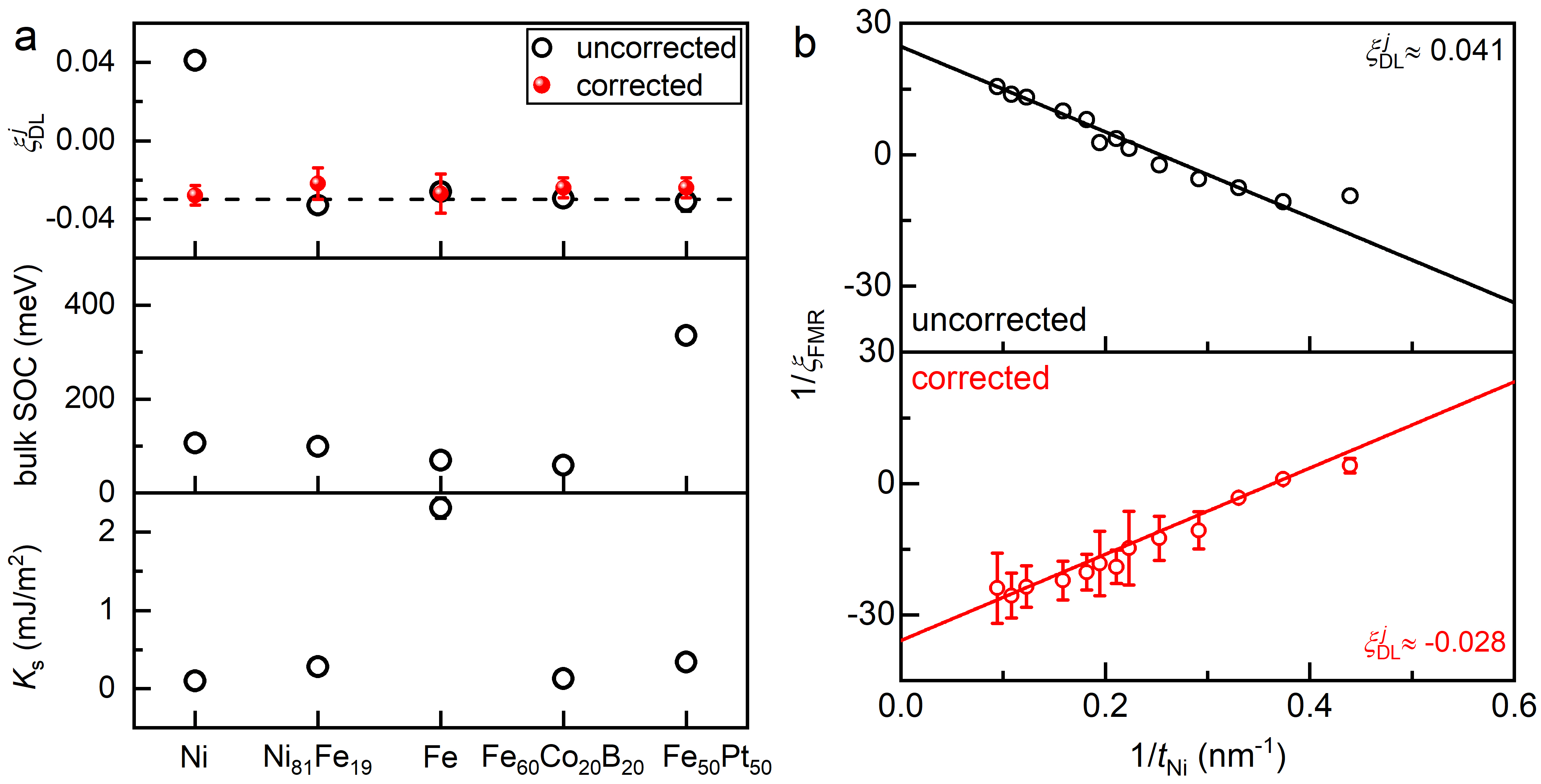 图2. (a)Ta/铁磁异质结中的自旋轨道矩、铁磁层的体自旋轨道耦合及界面垂直各项异性能密度(代表自旋轨道耦合强度),(b)对铁磁层自身的体自旋轨道矩修正前(uncorrected)和修正后(corrected)的Ta/Ni双层膜器件的自旋扭矩铁磁共振信号