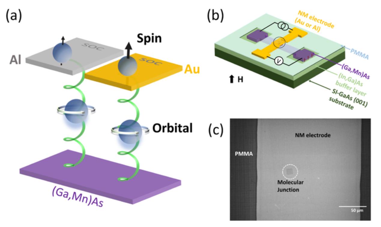 佛罗里达州立大学熊鹏教授团队与乐发vll赵建华研究员团队合作,以“磁性半导体/手性分子/非磁性金属”为核心构建自旋阀器件(图1),系统研究了具有不同自旋轨道耦合强度的金属电极对器件磁电导的影响,揭示了手性与电子自旋极化的转换机理。具体而言,当非磁性金属为具有强自旋轨道相互作用的Au电极时,能观察到显著的类自旋阀信号;而当非磁性金属为Al电极时,类自旋阀信号则减小了约一个数量级(图2)。魏茨曼科学研究所颜丙海教授从理论上指出,手性分子的结构不对称性使得电子产生轨道极化,而具有强自旋轨道耦合的非磁性金属电极进一步将电子的轨道极化转换为电子的自旋极化。在此基础上,该合作团队发展出一个势垒可调的隧穿模型,很好地对实验数据进行了定量解释。