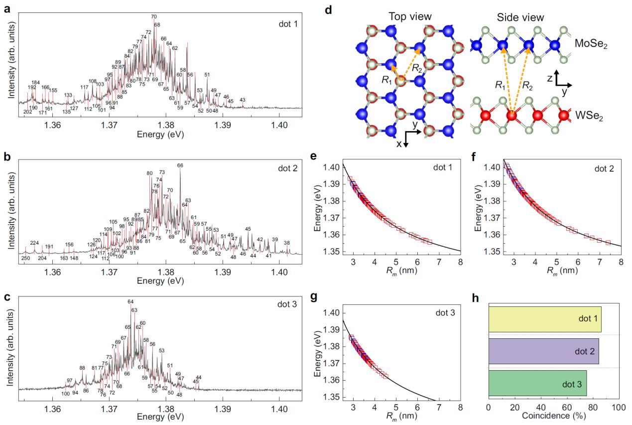 图1,DAP IX 荧光光谱。(a-c) IX PL光谱。(d) 范德华异质结中的DAP IX示意图。(e-g) 理论计算的DAP IX峰位和实验结果比较。(h) DAP模型的拟合度。