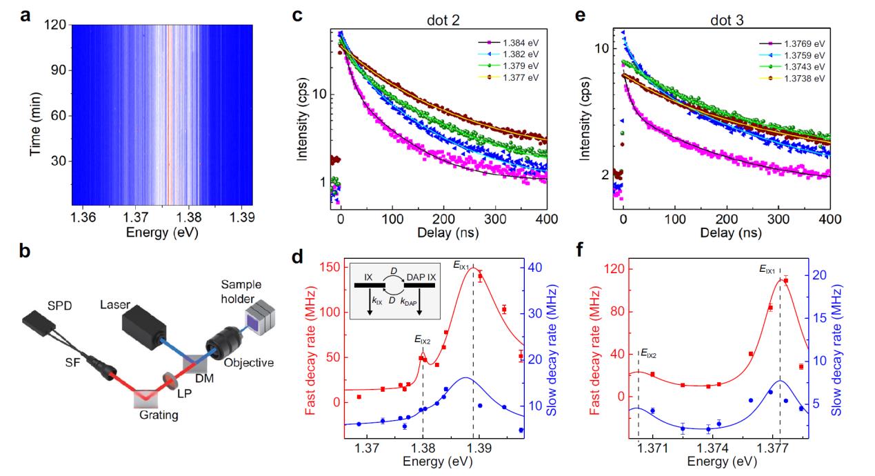 图2,局域IX发射的寿命能量关联。(a) IX荧光光谱随时间变化。(b)实验装置。(c-f) 能量和时间分辨的局域IX发射,及对应的衰减速率和能量的关系。
