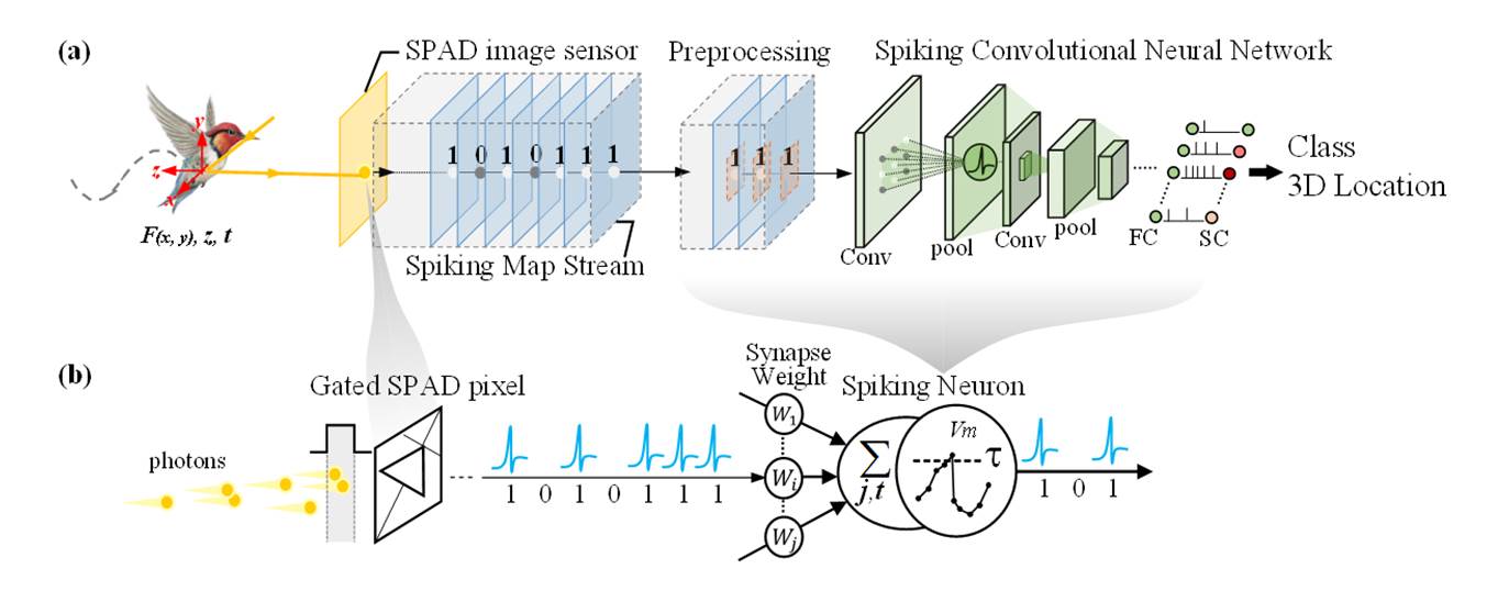 乐发vll刘力源研究员带领团队在脉冲型人工视觉芯片设计领域取得重要进展。团队创新性地设计了一款脉冲型人工视觉芯片,它集成了单光子脉冲型图像传感器和可重构脉冲视觉处理器,可实现视觉信息的获取、表达、处理和传输等全链路的信息脉冲化,更加接近了人类的视觉系统,为突破现有人工视觉芯片的瓶颈提供了一种新思路。芯片采用单光子雪崩二极管像素(SPAD)天然地生成高速脉冲型图像信号,并采用神经形态脉冲计算范式直接处理单光子脉冲视觉信号,构建了一个如图1所示的低复杂度、低延迟的脉冲视觉信号流处理系统。脉冲型人工视觉芯片可实现二维灰度成像和三维深度成像,并灵活地重构为脉冲图像信号理器(ISP)或脉冲神经网络处理器,实现二维三维视觉融合智能化处理;同时,通过实时智能图像处理判断不同成像场景,可以反馈控制图像传感器的配置参数,提升成像质量。测试结果表明,最高成像速率为每秒10万脉冲图像帧,动态范围高达100dB,具有二维三维融合的目标识别定位和光照自适应功能。图2和图3分别为芯片照片和测试结果。该项研究为体积和供电均受限的边缘视觉设备提供了实现低延迟多模视觉感算一体化高集成度片上系统芯片的新方法。