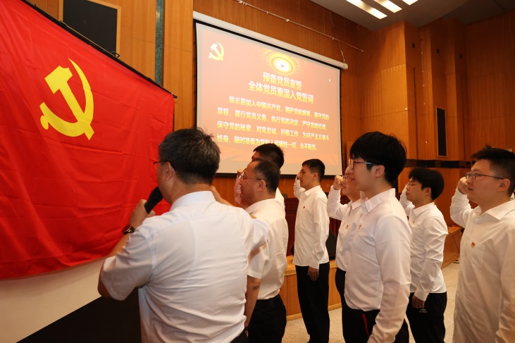 在预备党员宣誓环节,由机关第一党支部慕东同志领誓,李文昌研究员、马稳龙研究员等九位预备党员在鲜红的党旗下进行了庄严的宣誓,会场全体党员起立,与新党员一起再次重温入党誓词。在铿锵有力的宣誓声中,更加坚定了共产主义理想信念,增强了党的意识和党员意识。