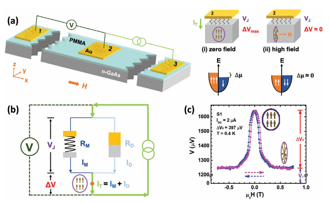 图1 (a) 横向自旋电子器件的结构示意图及原理示意图; (b) 横向自旋电子器件的等效电路图; (c) 实验测得的典型Hanle信号