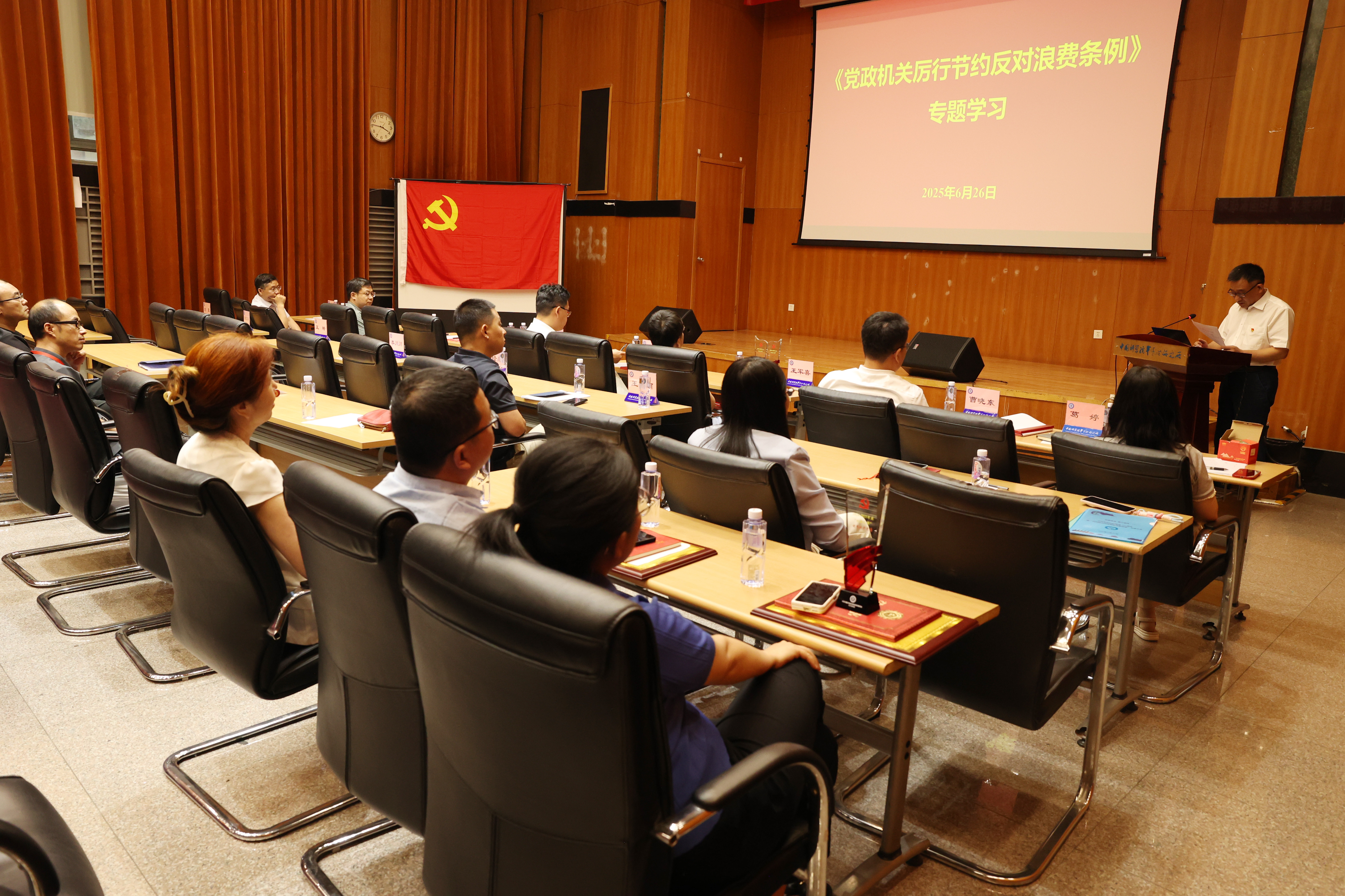在《党政机关厉行节约反对浪费条例》专题学习环节,项目经费管理办公室主任张建军、科技管理与成果处处长鉴海防、综合办公室主任葛婷分别结合经费管理、国内差旅、会议活动、因公临时出国、公务接待、公务用车等方面进行主题发言,分享了在实际工作中如何贯彻落实条例精神,加强管理、杜绝浪费。