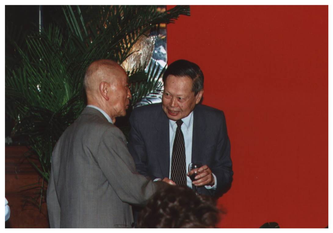 1992年6月1日,北京大学在勺园餐厅举行周培源先生九十大寿庆祝晚宴。晚宴前,当年西南联大时期的三剑客:杨振宁(右)、张守廉(中)和黄昆(左)三位老友重逢一起,留下了一张珍贵的合影