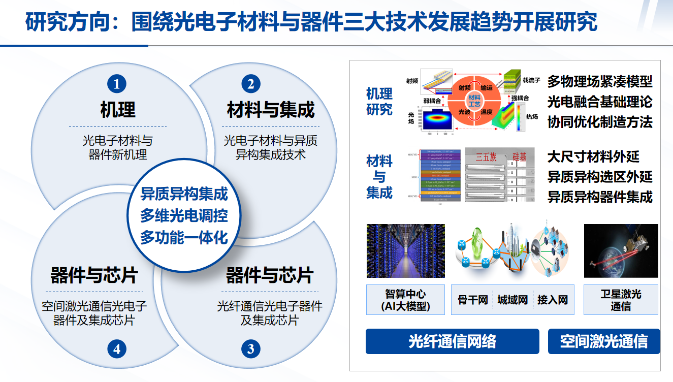 使命定位:面向光电子材料与器件前沿领域,聚焦异质异构集成、多维光电调控与多功能一体化等关键技术,开展前瞻性与原创性研究,构建“产-学-研”融合科技攻关联合体,满足国家光通信领域对高端光电子材料与器件的重大需求。